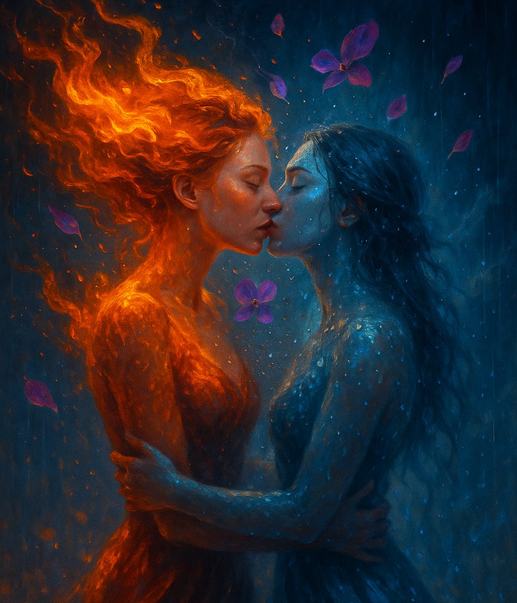 The first night, she dreamed of a paper sky that tore open to reveal another sky beneath it. A liquid landscape: koi fish drifting through clouds, a tree humming in a language she somehow remembered. She danced with a woman who was part flame, part rain. They kissed, and she tasted iron and orchids.
